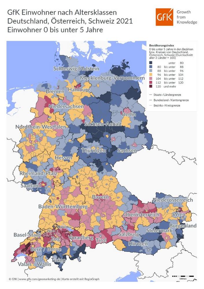 Das GfK Bild des Monats für Mai zeigt die regionale Verteilung der Babys und Kleinkinder bis vier Jahre in der DACH-Region im Jahr 2021.