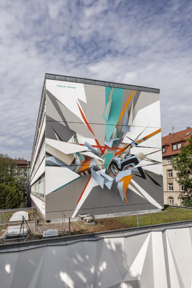 Mit Ende der Ausstellungslaufzeit verschwand auch die Fassadengestaltung. Ein wesentlicher Impuls von Graffiti ist es jedoch, ein bleibendes und für möglichst viele Menschen sichtbares Zeichen zu setzen. Wir freuen uns deshalb sehr, dass das Eberhard-Ludwigs-Gymnasium in Stuttgart-West eine prominente, weit über 100 Quadratmeter große Fläche der Schulfassade zur Verfügung stellte, auf der Mirko Reisser einen für ihn typischen explosiven und farbenprächtigen Style realisiert hat – und damit die Ausstellung WÄNDE I WALLS fort- und zugleich dauerhaft im öffentlichen Raum einschreibt.