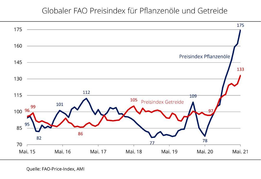 Der Pflanzenölindex der FAO bildet die Preisentwicklung der zehn für den Welthandel bedeutendsten Pflanzenöle ab, gewichtet nach deren Exportanteil. Dieser Index erreichte im Mai 2021 einen Durchschnittswert von 174,7 Punkten. Das entspricht einem Anstieg von knapp 8 % gegenüber dem Vormonat und rund 224 % gegenüber dem gleichen Zeitpunkt im Vorjahr. Der Aufwärtstrend der Palmölnotierungen hielt auch im Mai 2021 an: sie erreichten den höchsten Stand seit Februar 2011. Das langsame Produktionswachstum in Südostasien konnte mit der steigenden globalen Nachfrage nicht Schritt halten, so dass die Lagerbestände führender Exportnationen auf einem relativ niedrigen Niveau blieben. Sojaöl wurde durch die Aussichten auf eine robuste globale Nachfrage, insbesondere aus dem US-Biodieselsektor, gestützt, die Rapsölkurse vom anhaltend knappen globalen Angebot.