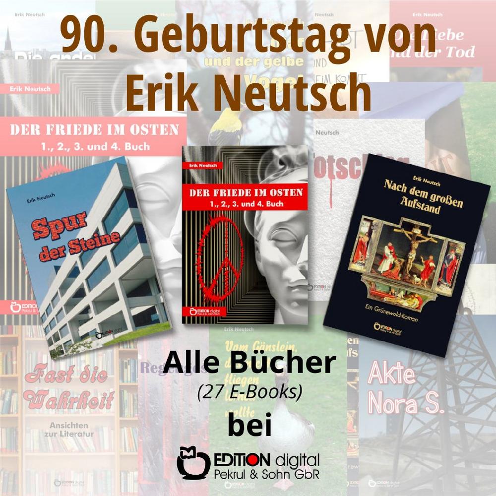 Das Gesamtwerk von Erik Neutsch ist allerdings sehr viel vielfältiger und umfangreicher, umfasst insgesamt 28 Bücher – alle 27 zu seinen Lebzeiten erschienenen sind zum 90. Geburtstag als E-Books bei EDITION digital im Angebot. Dazu gehören die Romane „Auf der Suche nach Gatt“, „Der Friede im Osten“ (4 Bände, 5. Band postum im Verlag Das Neue Berlin erschienen), „Totschlag“ und der Grünewald-Roman „Nach dem großen Aufstand“ sowie 13 Erzählungen, darunter „Die Regengeschichte“, „Akte Nora S.“, „Zwei leere Stühle“ sowie „Forster in Paris“ und „Stockheim kommt“. Neutsch hatte aber auch Kinderbücher wie „Olaf und der gelbe Vogel“ und „Vom Gänslein, das nicht fliegen lernen wollte“, den Gedichtband „Die Liebe und der Tod“ und Essays wie „Fast die Wahrheit“ geschrieben. Alle 27 E-Books von Erik Neutsch sind unter edition-digital.de sowie im Online-Buchhandel zu haben.