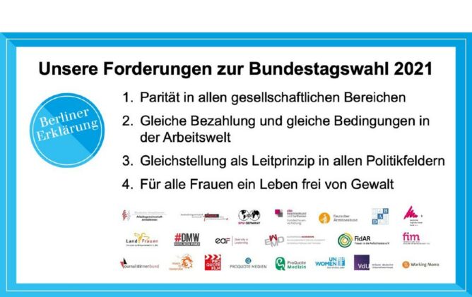 Mit gemeinsamer Stimme fordern die 41 Frauenverbände der Berliner Erklärung aus allen Bereichen der Gesellschaft die Politik zu entschlossenem Handeln auf: Ein „Weiter so“ darf es nach der Bundestagwahl im Herbst nicht mehr geben, es ist Zeit für Parität, ohne Ausnahmen. Nur mit verbindlichen gesetzlichen Regelungen lassen sich die Gender Gaps bis 2030 schließen. „Es […]