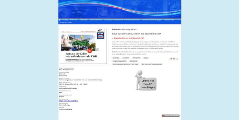 Ein BHKW der Leipziger Stadtwerke wird zum BHKW des Monats Juni gekürt