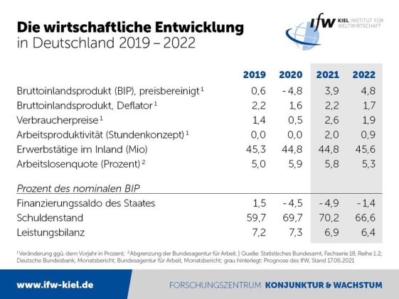 Die deutsche Wirtschaft erholt sich kräftig und dürfte im dritten Quartal wieder ihr Vorkrisenniveau erreichen. Das IfW Kiel erwartet in seiner jüngsten Konjunkturprognose für 2021 einen Zuwachs des Bruttoinlandsprodukts (BIP) um 3,9 Prozent (bislang 3,7) und für 2022 um 4,8 Prozent. „Produktionshemmnisse stehen einem noch stärkeren Aufschwung im Wege, was die Preise treibt“, so IfW-Konjunkturchef […]