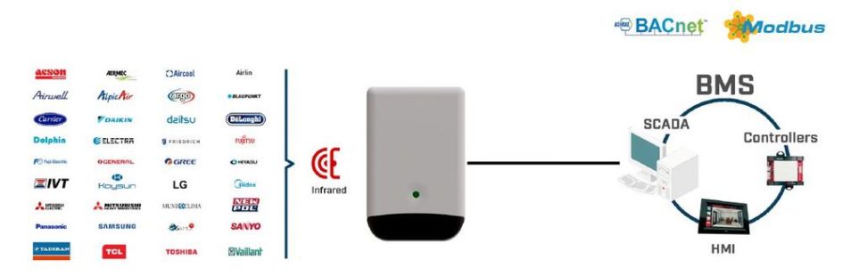 Control any air conditioning unit from Modbus or BACnet-based automation systems via IR