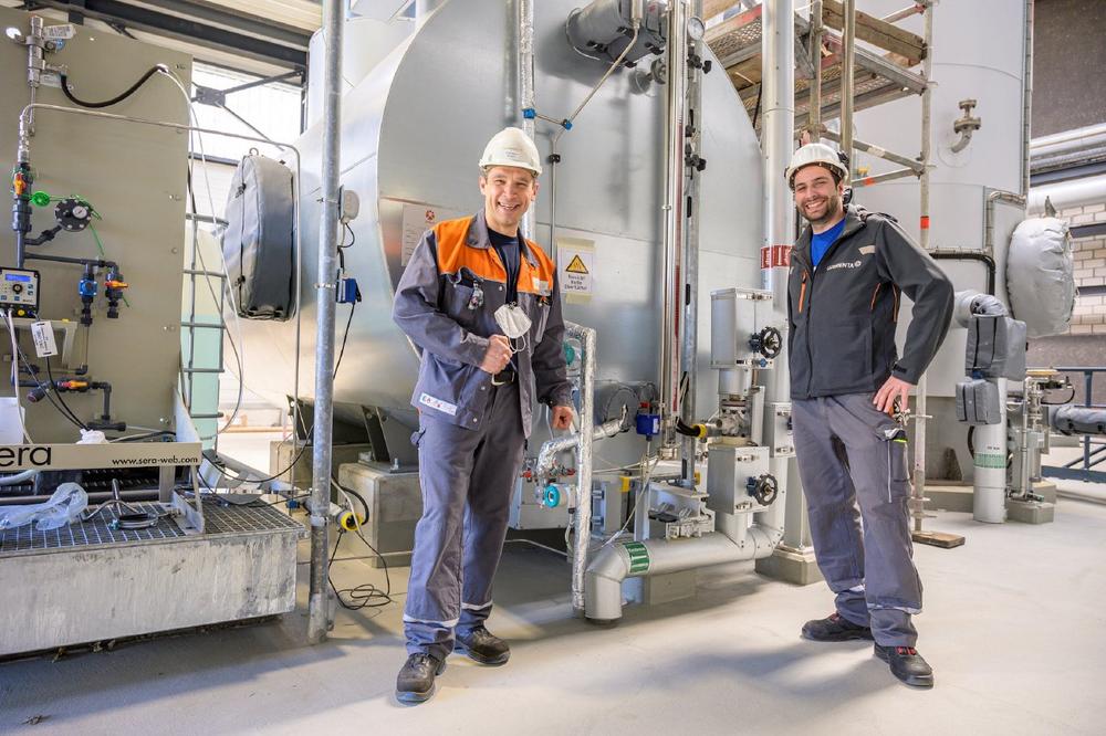 „Der Kessel kann über eine bereits vorhandene Heizschlange mit Heizdampf betriebsbereit gehalten werden, dafür braucht es keinen Strom“, erklären Betriebsmeister Waldemar Redich und PLT-Service-Techniker Stefan Saykowski. Die beiden hatten die Idee für die Umstellung – und freuen sich über die rasche Umsetzung: „Es ist toll, dass wir mit unserer Idee dazu beitragen konnten, Currenta ein Stück nachhaltiger zu machen“, sagt Redich. „Ich finde es gut, dass unser Unternehmen uns die Möglichkeit gibt, uns einzubringen. Davon profitieren am Ende alle“, ergänzt Saykowski.