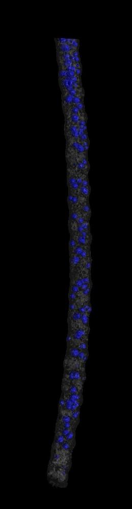 Erste Vorversuche mit Acrylnitril-Butadien-Styrol (ABS) zeigten, dass durch die Verwendung von treibmittelbeladenen Schmelzen mit dem AKF eine maximale Gewichtsreduktion von etwa 37 Prozent im Vergleich zum spritzgegossenen Vollmaterial und eine Gewichtsreduktion von 28 Prozent im Vergleich zu ungeschäumten AKF-Probekörpern erreicht werden. Abbildung 1 zeigt die CT-Aufnahme einer im AKF-Verfahren geschäumten ABS-Schicht innerhalb eines Bauteils. Eine gleichmäßige Verteilung der Poren ist erkennbar, was den Prozess deutlich von spritzgegossenen Schaumstrukturen abgrenzt. Diese zeichnen sich gewöhnlich durch eine kompakte Außenhaut mit zunehmender Porengröße im Bauteilinneren aus. Somit ist beim AKF-Verfahren eine Expansion über das gesamte Bauteil möglich und das Material liegt ebenmäßig zellulär vor. In Abbildung 2 ist ein einzelner aufgeschäumter ABS-Strang mit der erhaltenen geschlossenzelligen Schaumstruktur und homogenem Porendurchmesser zu sehen. Abbildung 3 zeigt zum Vergleich eine ungeschäumte ABS-Schicht mit gleichmäßiger Struktur, in Abbildung 4 ist die fehlende Stranghaftung durch Vergrößerung des Formfaktors für ungeschäumtes ABS erkennbar.