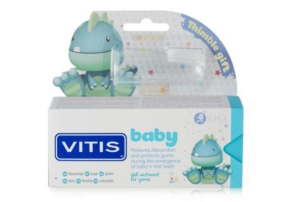 Bevor jedoch mit den Wackelzähnen gespielt werden kann, müssen diese erst einmal durchbrechen. Das Zahnen ist für die Kleinen oft unangenehm – das dazugehörige Quengeln auch für die Eltern. Der VITIS® Baby Gelbalsam kann die Beschwerden des gereizten Zahnfleisches mindern. Die beruhigende Kombination aus natürlichen Wirkstoffen wie Kamillen- und Süßholzwurzelextrakt sowie Panthenol (Provitamin B5) schützt und pflegt. Passend dazu umfasst die VITIS® Baby-Reihe einen Fingerling, mit dem die Eltern sanft morgens und abends das Zahnfleisch ihres Kindes massieren können.