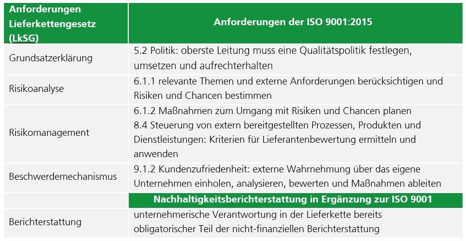 Die ISO 9001 für Qualitätsmanagementsysteme (QMS) fordert, dass sich Unternehmen mit Risiken auseinandersetzen, Lieferanten bewerten, Mechanismen zum Einholen von externen Wahrnehmungen ihrer Leistungen einrichten und jeweils Maßnahmen ableiten. An welchen Stellen sich die Anforderungen des Lieferkettengesetzes in ein QMS integrieren lassen, ist in der oben angefügten Tabelle zusammengestellt.