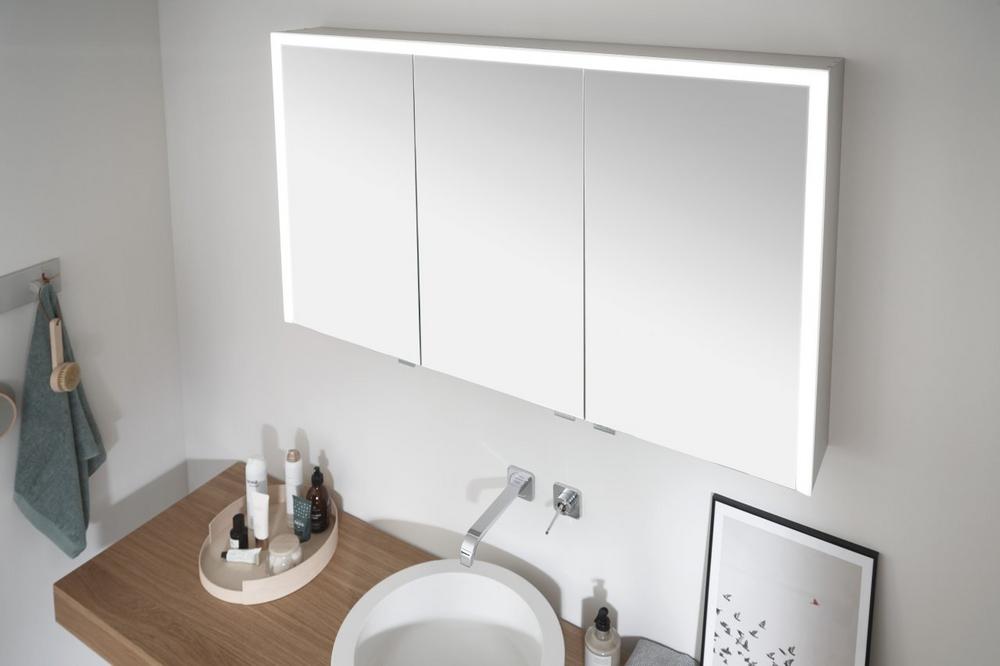 Die beleuchtete Rückwand setzt Flakons im Schrank in Szene und Licht von oben illuminiert auch bei geöffneten Türen. Licht, das den Waschplatz unter dem Spiegelschrank ausleuchtet, ist eine weitere Spielart von Licht im Bad. Die Auswahl ist so umfassend und unterschiedlich wie Platz und Einbausituationen in der Badestube.
