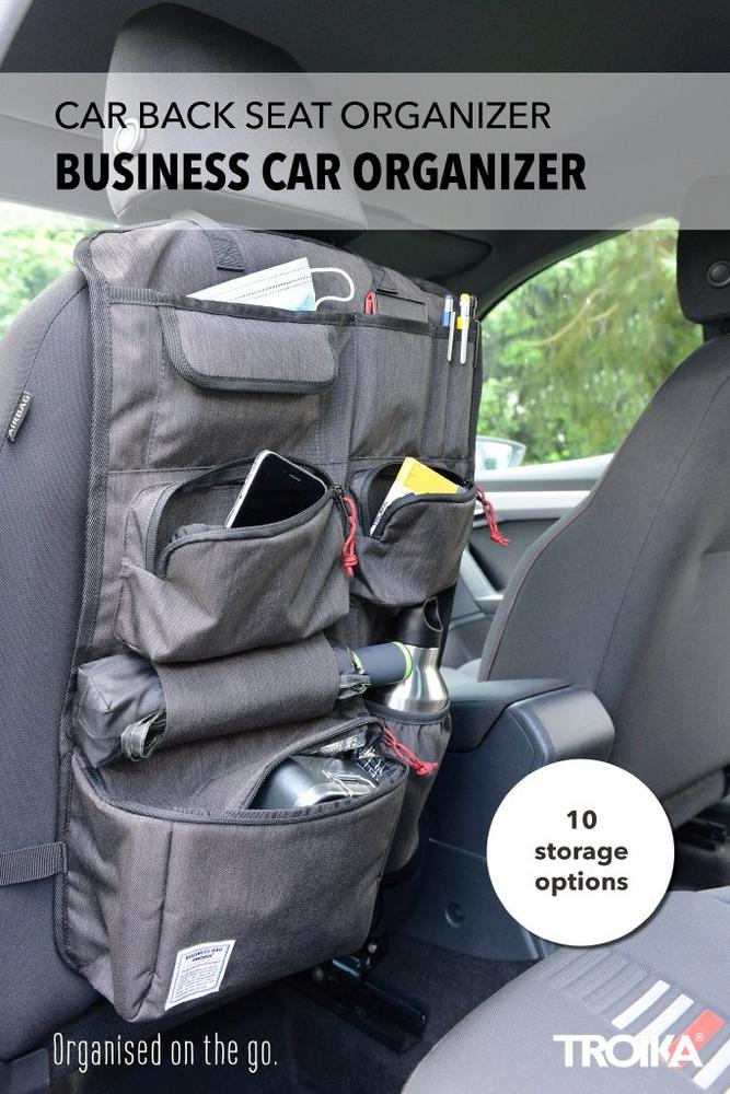 Auto Rücksitz-Organizer mit 10 Aufbewahrungsmöglichkeiten (Multifunktionstaschen, -schlaufen und Fächern), Rückenlehnenschoner (Trittschutz), bietet viel Stauraum für Dinge des täglichen Bedarfs (Every Day Carry), 2 Steckfäche für Stifte, 2 Einschubfächer, 1 Klettverschlussfach, 2 Reißverschlussfächer für Elektronikzubehör, 1 Kühlfach für Snacks, 1 Schlaufe für Regenschirm, 1 Fach für Trinkflasche, wasserabweisen, leicht zu reinigen, einfache Befestigung am Autositz mit 2 verstellbaren Gurten inkl. Steckverschluss, aufgeklappte Größe: ca. 41 x 60 cm, Polyester, anthrazit/schwarz