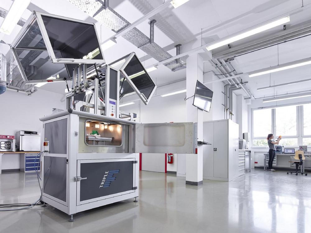 Der Maschinenpark umfasst alle etablierten 3D-Druckverfahren – darunter Stereolithografie (SLA), Digital Light Processing (DLP), Fused Layer Modeling (FLM), Lasersintern (LS), Arburg Kunststoff-Freiformen (AKF), Continous Filament Fabrication (CFF) und das Multi-Jet Fusion Verfahren (MJF). Ein enger Austausch mit den Anwendern und eine gute Zusammenarbeit mit den Anlagenherstellern ist dabei ein wichtiger Baustein für erfolgreiche Innovationen.
