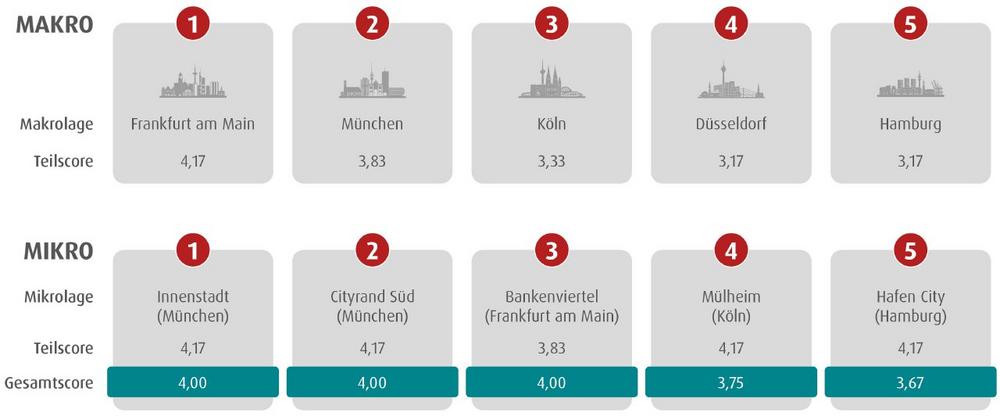 Im Rahmen der Studie wurden mit eigens konzipierten Scorecards sämtliche Mikrolagen der Top-7 vergleichbar gemacht. Das Update zeigt, dass sich der überwiegende Teil der Mikrolagen in einem herausfordernden Umfeld beweisen kann. Vier der sieben Standorte – München, Frankfurt am Main, Köln und Stuttgart – können ihre Mittelwerte steigern. Mit einem Score von jeweils 4,17 sind München-Innenstadt, München-Cityrand Süd, Köln-Mühlheim und Hamburg-Hafen-City die Top-Mikrolagen im Scoring. Als einziger Standort hat Düsseldorf eine Spitzenposition mit der Mikrolage Flughafen eingenommen. Einige Mikrolagen in Berlin, Düsseldorf und Hamburg sind in ihrem Score hingegen leicht rückläufig.