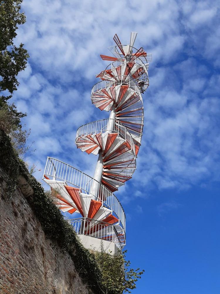 Aufgrund der schlanken und schiefen Bauweise des Turms, war die technische Umsetzung mehr als anspruchsvoll. So wurde beispielsweise, um unzulässiges Aufschwingen der Konstruktion zu vermeiden, ein Schwingungstilger in die Säule eingesetzt. Als Korrosionsschutzsystem kam eine dauerhafte und robuste Feuerverzinkung für sämtliche Stahlteile zum Einsatz. Die Gitterroststufen wurden als Duplex-System ausgeführt, das heißt sie wurden zusätzlich zur Feuerverzinkung aus gestalterischen Gründen pulverbeschichtet.