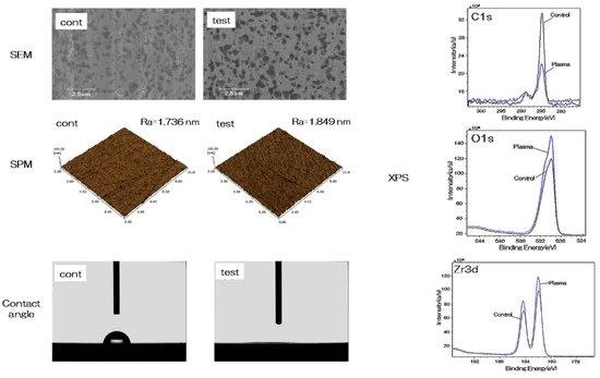 In this publication the effects of treating nano-ZR implants with cold atmospheric plasma were investigated. While the plasma treatment does not affect the roughness of the implant, superhydrophilicity could be achieved. In in vitro and in vivo studies, a faster and better protein, cell, and bone adhesion could be measured, from which can be concluded that atmospheric plasma treatment is useful as a prosthetic treatment option for patients allergic to metal.