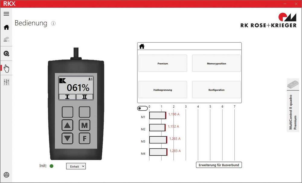 Mit der Software hat RK Rose+Krieger ein Servicetool geschaffen, das dem Kunden einen deutlichen Mehrwert liefert. Der Hintergrund: Das eigentliche Herzstück der Steuerung MultiControl II ist die Menüstruktur mit ihren vielfältigen individuellen Einstellungsmöglichkeiten – darunter zum Beispiel Antriebsgruppenmanagement, relative und absolute Positionierung, integrierte Kollisionserkennung und vieles mehr. Diese Einstellungen konnte der Anwender zuvor lediglich über den 6 -Tasten-Handschalter mit grafikfähigem Bildschirm tätigen. Mithilfe der neuen Software lässt sich das einfacher und schneller erledigen – dafür sorgen unter anderem die übersichtliche Gestaltung der Bedienoberfläche und konkrete Hilfestellungen wie Erklärungsvideos.