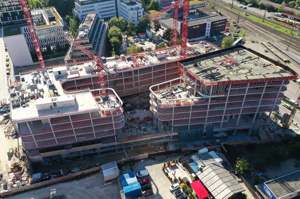 Seitdem die Bagger 2019 angerückt sind, läuft auf der Baustelle alles nach Plan. Der Rohbau für den fünfstöckigen Sockelbau ist bereits abgeschlossen, während der Rohbau des Hochhauses weiter voranschreitet und im März 2022 fertig sein wird. Auch die Installation der stilprägenden Fassade hat bereits begonnen. Im 4. Quartal 2022 können die Mitarbeiter*innen der KPMG AG voraussichtlich einen ersten Blick aus ihren zukünftigen neuen Büros werfen. Der Bezug durch KPMG wird im Frühjahr 2023 stattfinden.