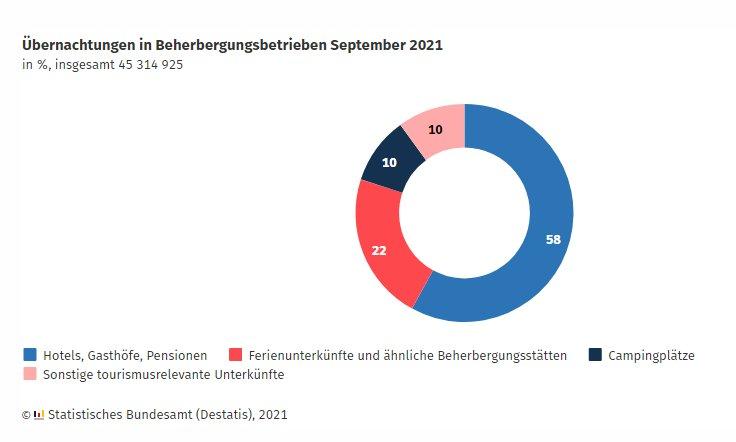 Von Januar bis September 2021 konnten die Beherbergungsbetriebe insgesamt 224,0 Millionen Übernachtungen verbuchen. Das waren 11,6 % weniger als im Vorjahreszeitraum. Dabei war die erste Jahreshälfte 2021 allerdings über einen längeren Zeitraum (teilweise bis Anfang Juni) durch ein coronabedingtes Beherbergungsverbot für privatreisende Gäste beeinflusst. Im Jahr 2020 waren in der ersten Jahreshälfte dagegen nur etwa zwei Monate (Mitte März bis Mitte Mai) davon betroffen.