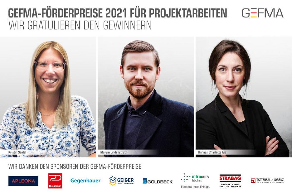 Die hohe Qualität des Nachwuchses im FM steht für die stetig steigende Professionalisierung der Branche und die kontinuierliche Modifizierung der Geschäftsbereiche. Darin zeigt sich das große Potential der Branche. Bei den GEFMA-Förderpreisen für die Fachwirtausbildungen treffen wissenschaftlich fundierte Inhalte auf praxisbezogenes Knowhow. Die Verleihung der Förderpreise für Projektarbeiten findet seit 2003 jährlich statt. Ein großer Dank gilt den Sponsoren, ohne die die Förderpreisverleihung nicht möglich wäre.
