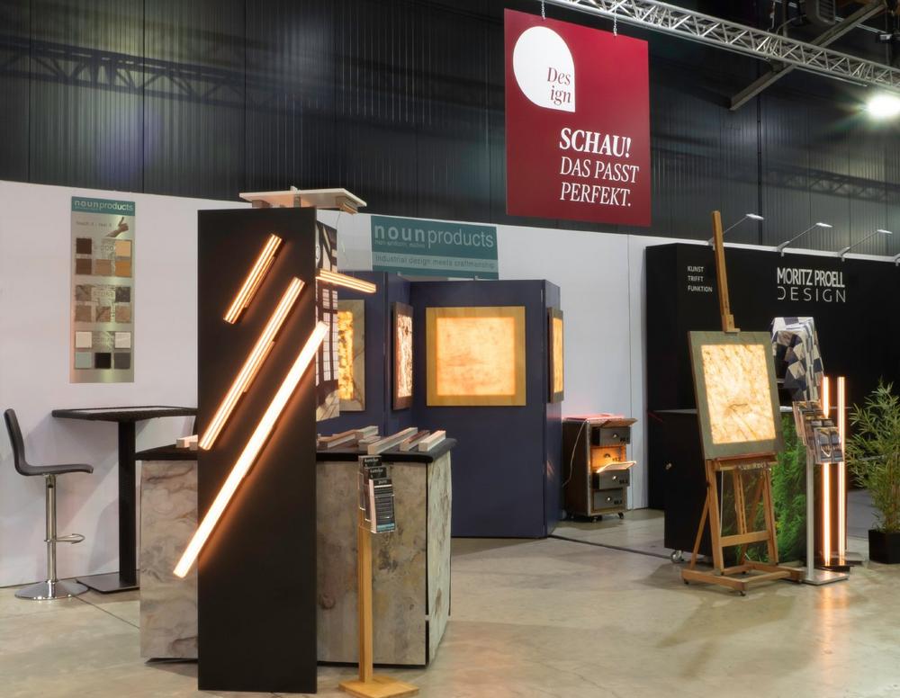 Belau hat in der Wiener Marx-Halle das gesamte Portfolio seiner Marke nounproducts zur Schau gestellt. Besonderes Augenmerk lag dabei auf seiner neuesten Kreation, der LumiRock Art Edition. Dabei handelt es sich um einzigartige Lichtobjekte mit einer hauchdünnen Gesteinsschicht, die auf dieser Messe erstmals live ausgestellt wurden. „Ich war sehr gespannt, wie die Idee, das Konzept und die Umsetzung mit kritischem Blick gesehen wird. Das Feedback fiel für mich dabei insgesamt sehr erfreulich aus. Auch die Marx-Halle ist sehr beeindruckend und bot mir und allen anderen Ausstellern den perfekten Rahmen, um anspruchsvolles Design angemessen in Szene zu setzen.“