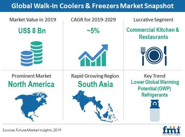 FMI’s research study also offers a long-term perspective and thorough analysis of opportunities present in the walk-in coolers and freezers market for the period between 2019 and 2029. As per the study, the global walk-in coolers and freezers market is projected to register a CAGR of 5.6% during the forecast period.