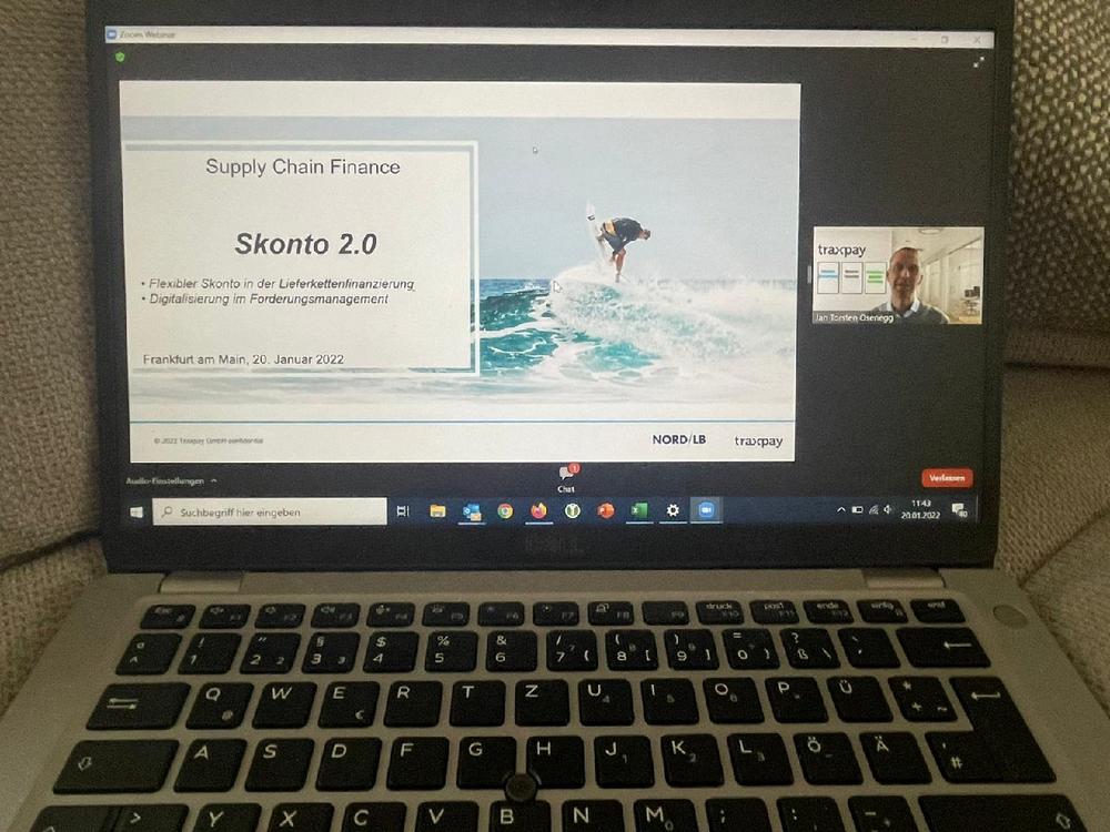 Im Anschluss stellte Traxpays Head of Finance Jan Osenegg den Skonto 2.0 vor. Dabei handelt es sich um einen dynamischen Skonto, der basierend auf einem Jahreszinssatz tagesgenau berechnet wird. Das ganze wird durch Plattformen ermöglicht, die dies für alle Beteiligten optimal orchestrieren. Bei Bedarf erhält der Lieferant gegen ein geringes Entgelt sein Geld früher. Die transparenten Konditionen sorgen für ein faires Miteinander und eine Stabilisierung der Lieferanten und Kunden-Lieferanten-Beziehungen. Die Finanzierung erfolgt entweder durch eigene Liquidität (gerade in turbulenten Zeiten haben sich viele Unternehmen ein Liquiditätspuffer aufgebaut) oder durch die Hausbank.