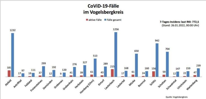 Das Gesundheitsamt meldet am Mittwoch 122 Neuinfektionen mit dem Corona-Virus, verteilt auf nahezu alle Städte und Gemeinden im Vogelsbergkreis. 133 Menschen meldeten sich bei der Behörde als genesen, sodass dort aktuell 1072 aktive Fälle betreut werden. Aufgrund der zurzeit massiv ansteigenden Infektionszahlen kann es zu abweichenden Angaben auf dem Corona-Dashboard des Robert-Koch-Instituts (RKI) kommen. Laut […]