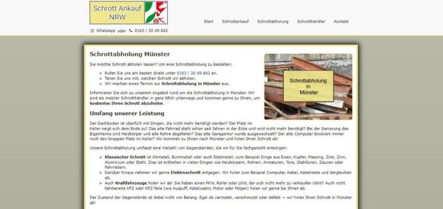 Die Schrottabholung Münster bietet ihren Kunden eine kostenlose Schrottabholung an Schrott verstopft vielerorts Lagerflächen. Seien es die Keller, Hofflächen und Dachböden der Privathaushalte oder die diverse Flächen auf Werksgeländen: Der Schrott stapelt sich und fristet ein vergessenes Dasein. Doch das sollte nicht sein, denn vom Platzverlust einmal abgesehen sind im Schrott und insbesondere im Metallschrott […]