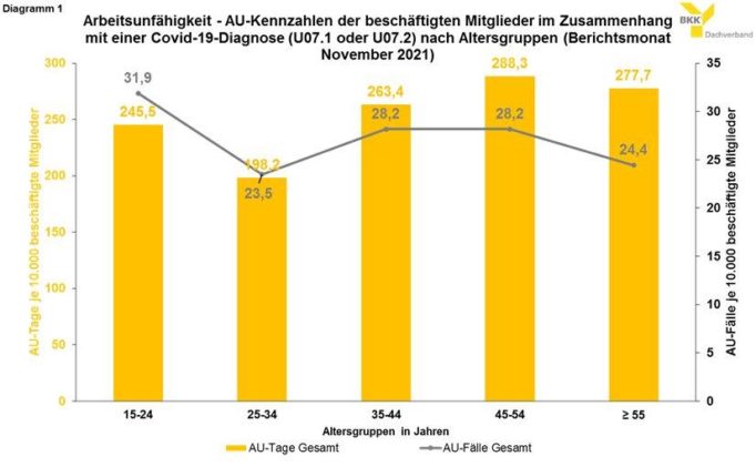 Die Krankheitsfälle der COVID-19 Erkrankungen sind deutlich gestiegen. Insgesamt sind im November 2021 104.935 AU-Tage mit einer durchschnittlichen Falldauer von 9,6 AU-Tagen je Fall zu verzeichnen. In Relation zu den rund vier Millionen in die Auswertung eingeschlossenen berufstätigen Mitgliedern bei einer Betriebskrankenkasse, treten somit 26,7 AU-Fälle bzw. 256,2 AU-Tage je 10.000 Beschäftigte im Zusammenhang mit […]