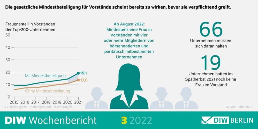 Forscherinnen von DIW Berlin und FU Berlin nehmen erneut etwa 500 große Unternehmen, darunter die 200 größten, in Deutschland unter die Lupe – Frauenanteile in Vorständen steigen vielerorts stark, Dynamik in Aufsichtsräten verhaltener – Gesetzliche Mindestbeteiligung in Vorständen wirft positiven Schatten voraus Nachdem es jahrelang höchstens in kleinen Schritten voranging, haben große Unternehmen der Privatwirtschaft […]