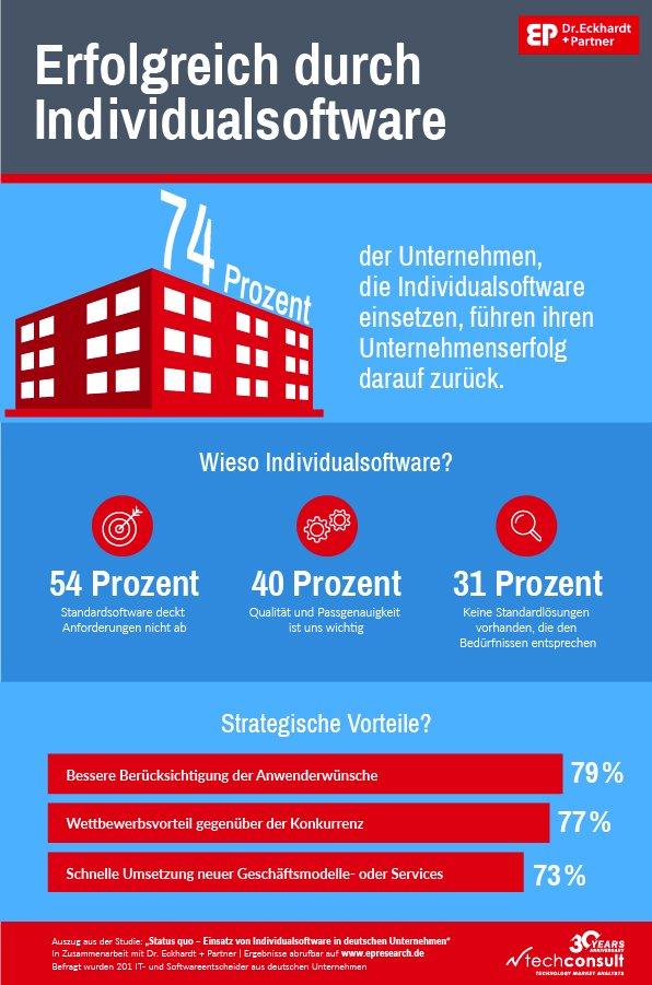 Das Research- und Analystenhaus techconsult hat im Auftrag von Dr. Eckhardt + Partner untersucht, wie deutsche Unternehmen aktuell beim Einsatz von individuellen Softwarelösungen aufgestellt sind und wie derartige Lösungen als Treiber neuartiger und innovativer Technologien eingesetzt werden. Für die veröffentlichte Studie „Status quo – Einsatz von Individualsoftware in deutschen Unternehmen“ wurden insgesamt 201 IT- und Softwareentscheider aus deutschen Unternehmen zum Einsatz und den Einsatzgründen von individuellen Softwarelösungen befragt.