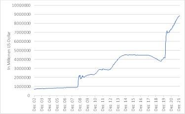 Seit der Einführung des Anleihekaufprogrammes Anfang 2020 ist die Bilanz der Fed von rund 4 Billionen US-Dollar auf fast 9 Billionen US-Dollar angestiegen. Das ist in etwa vier Mal so hoch wie nach der Finanzkrise 2008 (Vgl. Abbildung 1). Ein signifikanter Teil des Geldes floss in amerikanische Staatsanleihen, um riesige Investitions- und Hilfsprogramme der Regierung zu finanzieren. Die Schulden des amerikanischen Staates stiegen während der Pandemie um rund 5 Billionen US-Dollar und belaufen sich inzwischen auf mehr als 28 Billionen US-Dollar. Das entspricht einer Schuldenquote von ca. 122 Prozent.