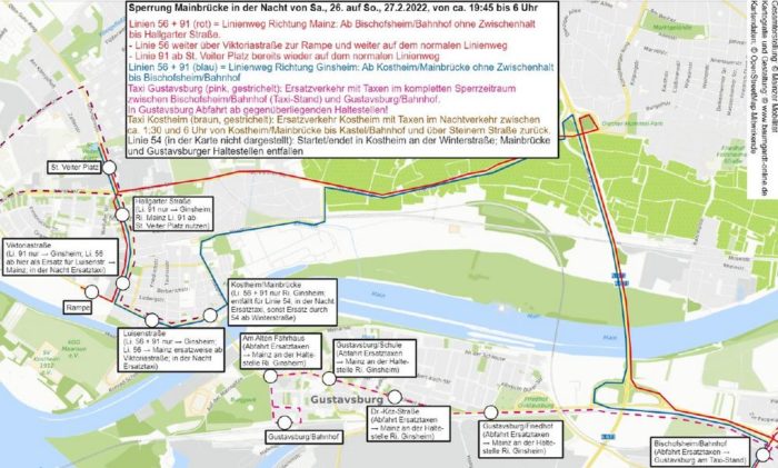 In der Nacht von Samstag, 26. auf Sonntag, 27. Februar 2022, von ca. 19:45 Uhr bis 6 Uhr, müssen die Buslinien 54, 56 und 91 zwischen Bischofsheim und Kastel weiträumig umgeleitet werden. Grund ist die Vollsperrung der Mainbrücke zwischen Gustavsburg und Kostheim aufgrund von Bauarbeiten. Die Daten der Fahrpläne sind bereits in den elektronischen Fahrplanauskünften […]