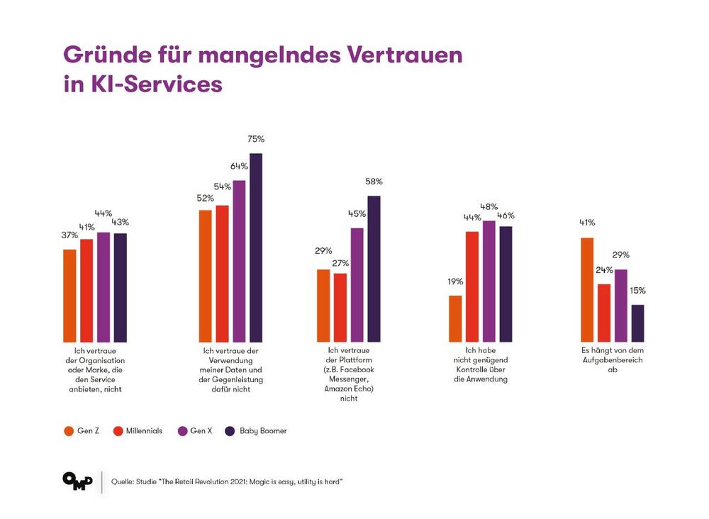 Die Zahlen zeigen: Die Magie, die KI versprüht, hat bis hierher funktioniert. Um jedoch in der Breite akzeptiert zu werden, muss die Technologie einen handfesten Nutzen liefern – hier gibt es noch offene Flanken – insbesondere, was das Vertrauen in die datenbasierte Technologie betrifft. So vertrauen durchschnittlich 41 Prozent der Befragten Unternehmen oder Marken, die KI-Services anbieten, nicht. Dieses Misstrauen ist, wie zu erwarten war, unter den deutschen Befragten mit 49 Prozent noch einmal höher. D.h., ein Großteil der Verbraucher*innen fehlt noch Vertrauen in die Verwendung ihrer Daten und die Gegenleistung, die sie dafür erhalten.