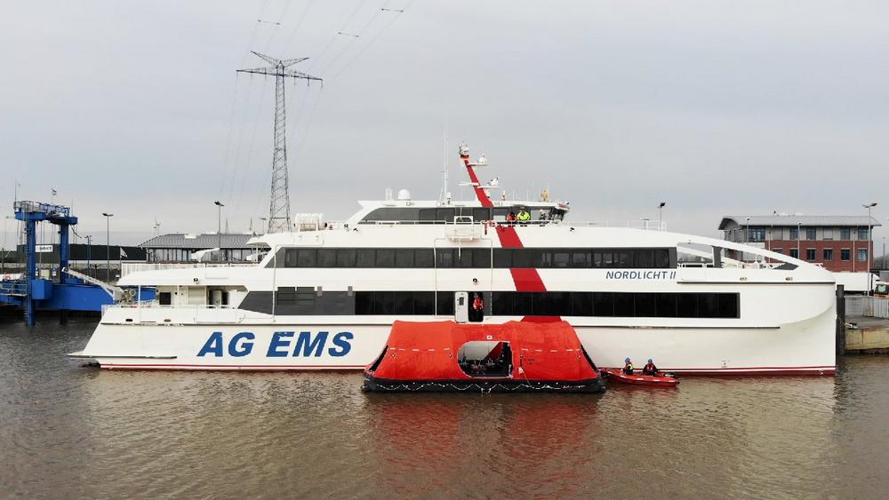 Am Dienstag, den 1. März wurde die noch ausstehende Rettungsübung durchgeführt. Corona-bedingt wurde auf freiwillige Teilnehmer verzichtet und lediglich der Ablauf einmal wie im Ernstfall durchgespielt. Dazu musste u.a. eines der Rettungsflöße zu Wasser gelassen und ausgelöst werden. „Das gehört zu einer Klassenabnahme dazu“, erläutert AG „EMS“-Inspektor Claus Hirsch die Übung.