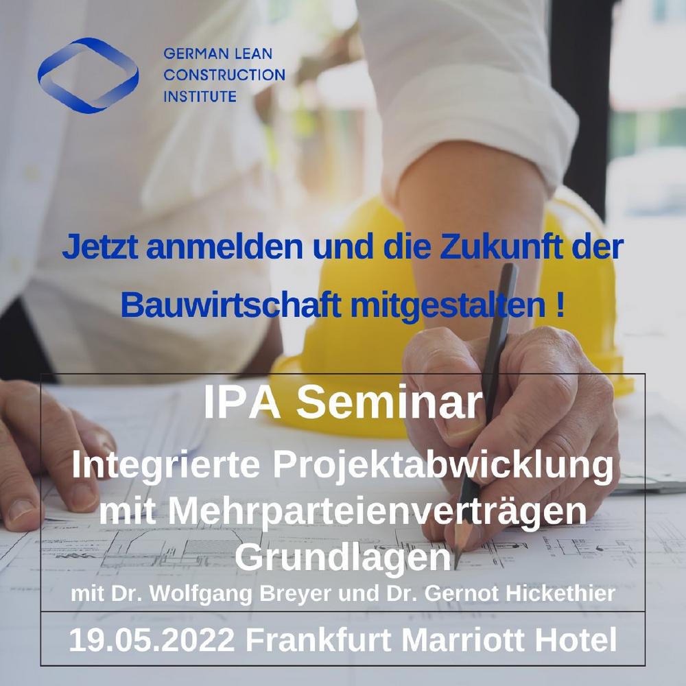 Lernen Sie in unserem IPA Grundlagenseminar – am 19.05.2022 in Frankfurt am Main – wie Bauprojekte mit innovativen Vertragsmodellen, neuen Planungsmethoden und kollaborativer Realisierung neu gedacht werden. Unsere Seminarleiter Dr. Jur. Wolfgang Breyer und Dr. Gernot Hickethier freuen sich auf Ihre Teilnahme.