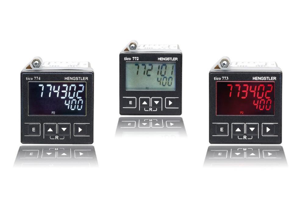 Mit dem tico 77x hat Hengstler einen elektronischen Zähler entwickelt, der sich für eine Vielzahl an Anwendungen eignet. Ob als Impulszähler, Tachometer, Zeitzähler, Schichtzähler oder Batchzähler: Der tico 77x überzeugt durch eine Eingangsfrequenz von bis zu 60 kHz, ein großzügig gestaltetes zweizeiliges Display und eine Ziffernhöhe von 9,3 mm bzw. 7,2 mm (2. Zeile). Das Display verfügt zudem über eine Hintergrundbeleuchtung, bei der aus vier verschiedenen Ziffernfarben gewählt werden kann. Es sind bis zu 3 Vorwahlen (P0,P1,P2) als Absolut- oder Schleppvorwahl und als Bereichssignal/Grenzwert möglich – auch eine negative Vorwahl kann definiert werden. Die Ausführungen tico 773 und tico 774 besitzen zudem eine USB- bzw. RS232-Schnittstelle, über die eine schnelle und unkomplizierte Kommunikation mit einem angeschlossenen PCs garantiert ist. Beide Zähler sind darüber hinaus mit einem Programmierassistenten ausgestattet.