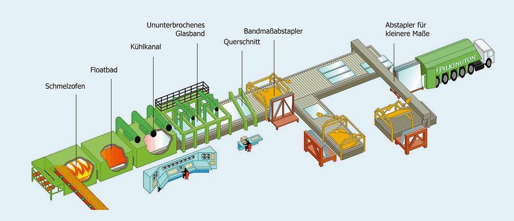 Diese Rohstoffe werden in Silos gelagert und abgewogen in einem Mischer zu einem „Gemenge“ verarbeitet. Anschließend gelangt das Gemenge über Transportbänder in die Einlegemaschie, die es der Schmelzwanne zuführt. Nun beginnt der eigentliche Prozess, der als Floatverfahren bezeichnet wird. Das Gemenge wird mit ca. 1.600 °C durch Brenner erhitzt. Danach befindet sich das flüssige Gemenge auf einem sogenannten Floatbad. Hierbei handelt es sich um ein mit flüssigem Zinn gefüllten Becken. Auf der Oberfläche dieses Bades entwickelt sich ein Glasband mit planparallelen Oberflächen, das mit Hilfe von Toprollern auf eine gewünschte Dicke gebracht werden kann.