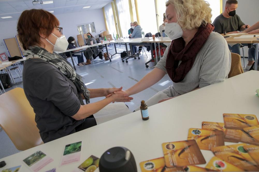 Die Führungskraft Karin Jakobs kann die Einführung auch nur befürworten: „Wir wenden auf meiner Station in der Wochenpflege ätherische Öle bereits erfolgreich an“. Für die Teilnehmer:innen des ersten Moduls hat sich die Fortbildung gelohnt: „Ein abwechslungsreicher Tag, einfach spannend“, so Praxisanleiterin Beate Palomba. Was macht Aromapflege eigentlich aus? Die Düfte der vielfältigen ätherischen Öle fördern die Selbstheilungskräfte des Körpers. Sie können gegen unangenehme Gerüche eingesetzt werden und unterstützen bei Hautpflege, Einreibungen und Waschungen.
