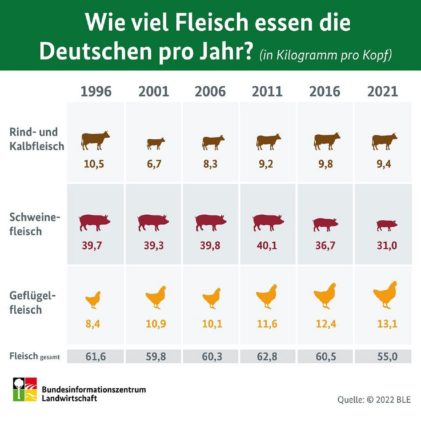 Der Pro-Kopf-Verzehr von Fleisch sank im Vergleich zu 2020 um 2,1 Kilogramm und liegt damit auf einem neuen Rekordtief seit Berechnung des Verzehrs 1989. Das zeigen die vorläufigen Angaben des Bundesinformationszentrums Landwirtschaft (BZL). Insgesamt wurde 2021 Fleisch mit einem Schlachtgewicht von 8,3 Millionen Tonnen erzeugt – rund 2,4 Prozent weniger als im Vorjahr. Der Pro-Kopf-Verbrauch […]