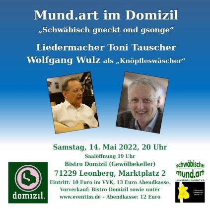 Mund.art im Domizil: „Schwäbisch gneckt ond gsonge“ Mit dem Liedermacher Toni Tauscher und Wolfgang Wulz als „Knöpfleswäscher“ Samstag, 14. Mai 2022, 20 Uhr (Saalöffnung 19 Uhr), Bistro Domizil (Gewölbekeller) 71229 Leonberg, Marktplatz 2 Eintritt: 10 Euro im VVK, 13 Euro Abendkasse. Vorverkauf: Bistro Domizil sowie unter www.mund-art.de/unser-ticket-lädle – Abendkasse: 12 Euro Toni Tauscher Seine Leidenschaft […]