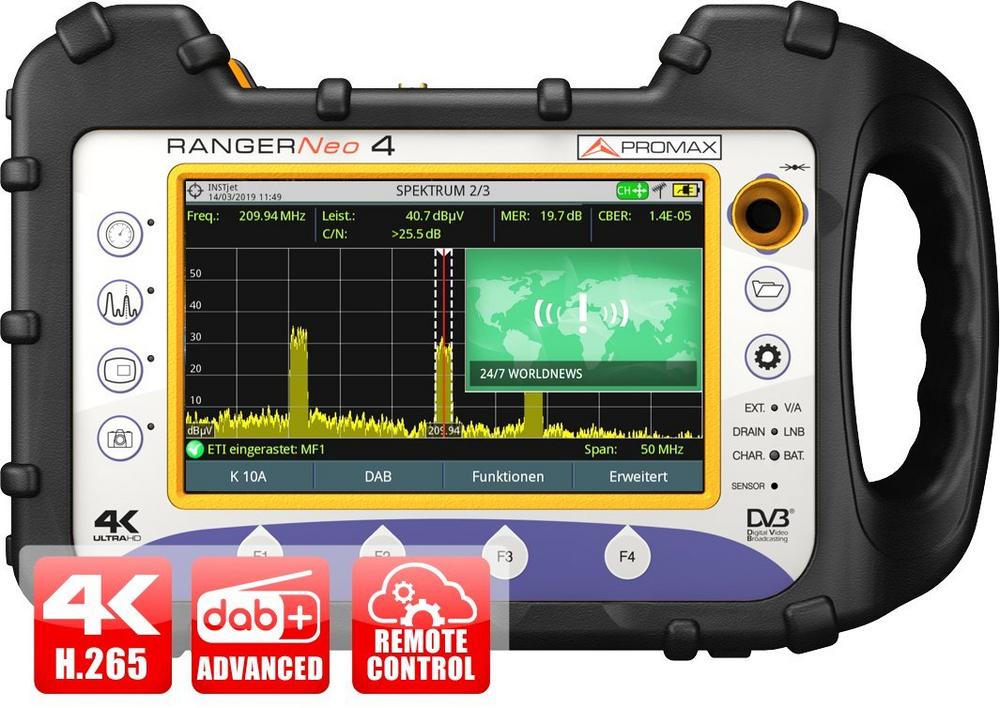 Kein Signal bleibt den RANGER Neo Messgeräten verborgen, Analog-TV oder IPTV, FM oder DAB+, WLAN oder Glasfaserübertragung. Für alle Signale bieten die Geräte umfangreiche Messund Analyseverfahren. Hinzu kommt Fernwartung, GPS und eine Akkulaufzeit von mehr als 4 Stunden.