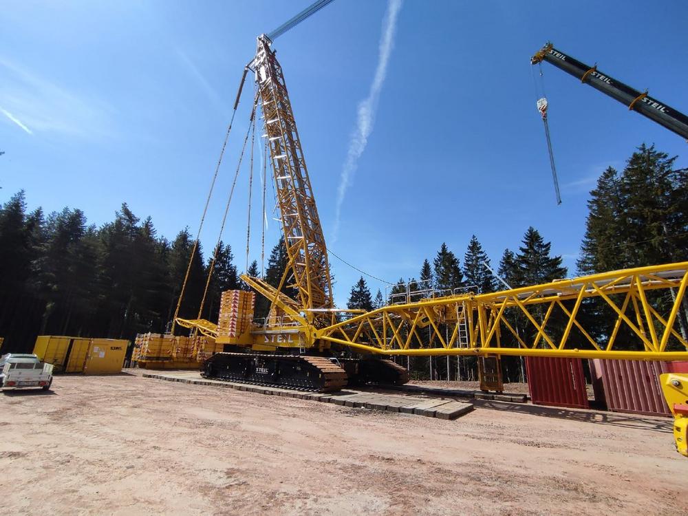 Die Flügel der Anlagen 3 und 4 werden in Kürze abmontiert, fabrikneue Flügel angebracht. Den neuen Rotorblattsatz, bestehend aus drei Rotorblättern, liefert der Hersteller Enercon bis zur Logistikfläche. Der folgende Spezialtransport wird von der Firma Steil ausgeführt. Die Rotorblätter sind für die Windenergieanlage 3 bestimmt. Die erste Fahrt des Selbstfahrers von der Logistikfläche in den Windpark startet in der Nacht von Sonntag, 24.04. auf Montag, 25.04. Die rund 70 m langen Flügel auf den Berg zu transportieren, erfordert nicht nur ein Spezialfahrzeug, sondern auch eingespielte Teams, die dieses steuern. Durch den Selbstfahrer können die Flügel nahezu senkrecht aufgestellt werden, so dass Bäume und Gebäude, die an der kurvigen Strecke liegen, nicht gestreift werden. Am Standort selbst ist bereits ein Baukran aufgestellt, so dass der Austausch rasch starten kann.