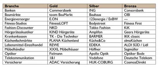 Die Anbieter mit den stabilsten und zugleich höchsten Rangplätzen stellen ihre Kundinnen und Kunden nachweislich am verlässlichsten zufrieden. Im Folgenden sind die ersten drei nach Medaillen-Rängen und für alle ausgewählten Branchen aufgelistet.