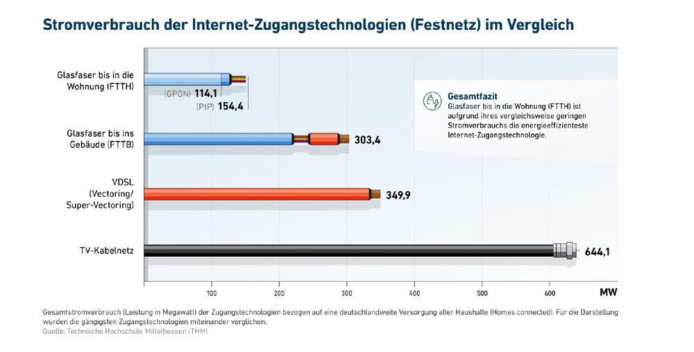 Hochgerechnet auf die flächendeckende Versorgung Deutschlands hätten reine Glasfasernetze (FTTH) einen Stromverbrauch von 154 Megawatt. Zum Vergleich: Kupferbasierte Netze (FTTC) benötigen im gleichen Szenario 350 Megawatt und TV-Kabelnetze 650 Megawatt. Gegenüber TV-Kabelnetzen ließen sich mit Glasfaser demnach 496 Megawatt einsparen. Das entspricht mehr als 50 Prozent der Leistung des Braunkohlekraftwerks Schkopau in Sachsen-Anhalt. Durch Optimierungen der Hardware-Komponenten, beispielsweise der Router, lässt sich der Stromverbrauch weiter senken.