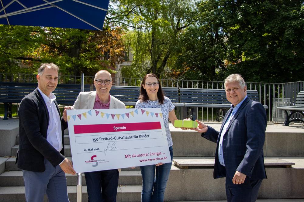 Auch in diesem Jahr unterstützt die Stadtwerke Weimar Stadtversorgungs-GmbH die jüngsten Badegäste. Insgesamt sponsert der regionale Energieversorger 750 Eintrittskarten für Kinder im Wert von 2.250 Euro. Diese nahm Frau Sina Solaß, die Kinder- und Jugendbeauftragten der Stadt, zur Saisoneröffnung vom Geschäftsführer der Stadtwerke Weimar, Jörn Otto, entgegen. „Wir freuen uns, Weimarer Kindern den Badespaß in unserem Freibad mit dieser Aktion zu ermöglichen.“, sagt Jörn Otto. Frau Solaß wird über die bedarfsgerechte Verteilung entscheiden und diese über das Kinderbüro koordinieren.