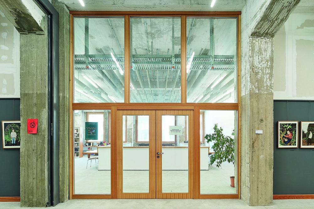 Ebenso hochschalldämmend sind neben den transparenten Elementen auch die Doppelwandpaneele – also die opaken Ausfachungen der Massivholzrahmen. Mit Brandschutzanforderung erreicht dieses Bauteil einen erhöhten Schalldämmwert von bis zu Rw = 50 dB und als reines Schallschutz-Element sogar bis zu Rw = 53 dB.
