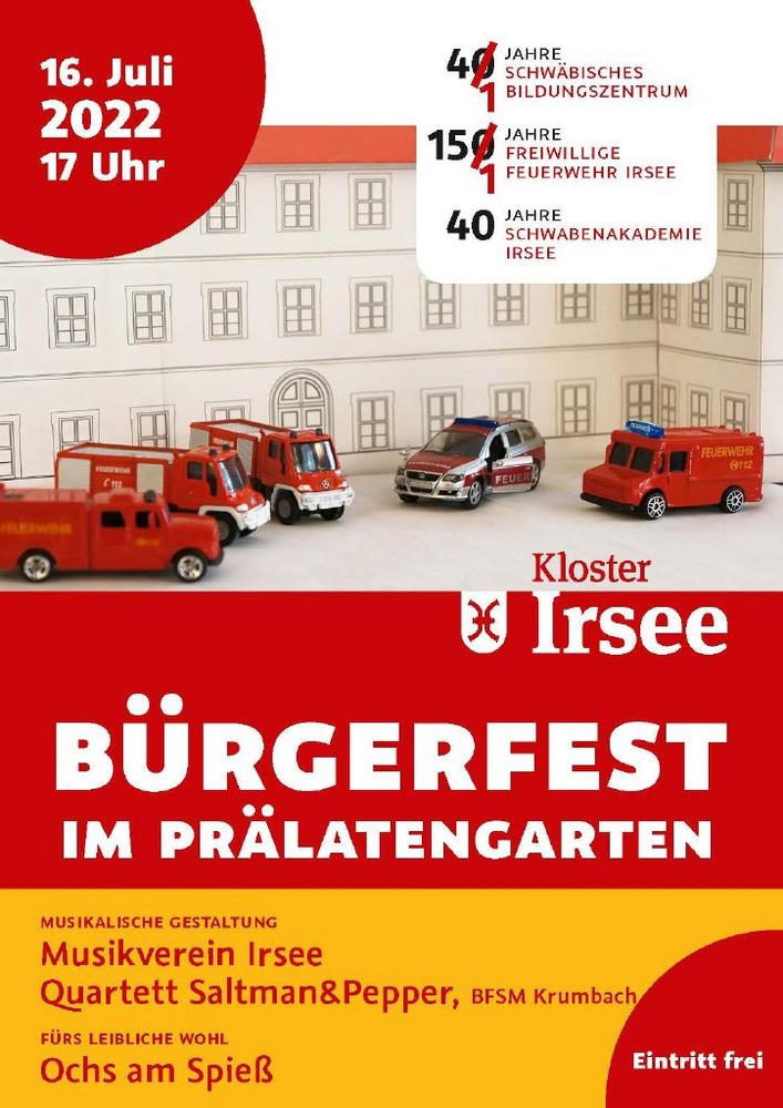 Eigentlich wollte man in Kloster Irsee bereits im letzten Sommer feiern: 40 Jahre Schwäbisches Bildungszentrum gemeinsam mit dem 150. Geburtstag der Freiwilligen Feuerwehr Irsee. Pandemiebedingt findet das Bürgerfest mit Bezirkstagspräsident Martin Sailer jetzt am kommenden Samstag, 16. Juli 2022, statt – pünktlich zum 40. Jubiläum der Schwabenakademie Irsee.