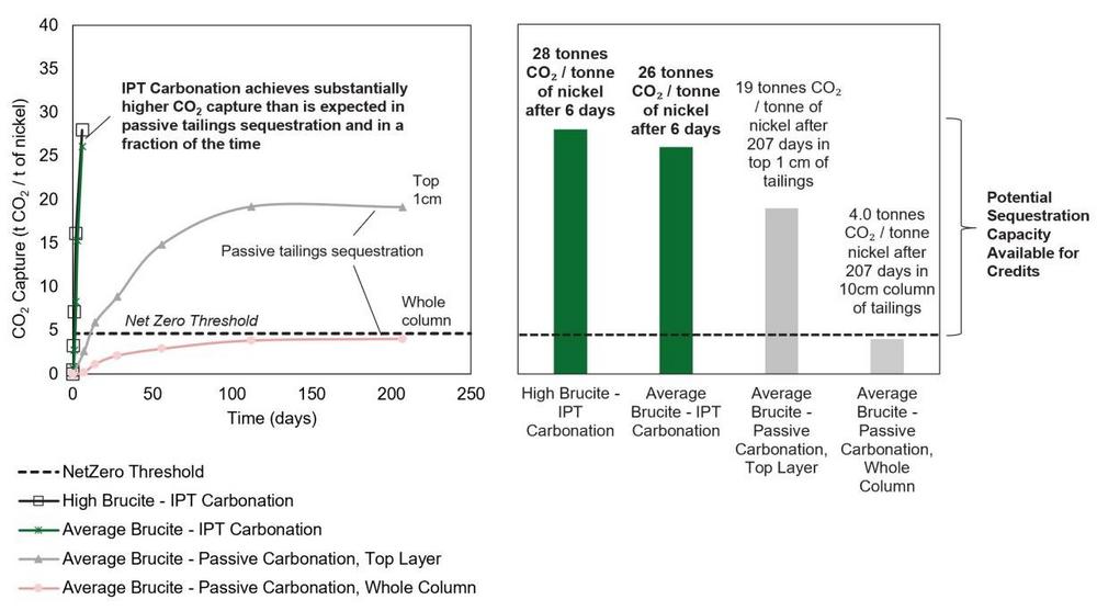 The IPT Carbonation process utilizes tailings directly from the mineral processing circuit and conditions them with CO2 for a brief period of time. After this conditioning, the tailings achieved the Net Zero carbon capture target in less than 36 hours and achieved gross carbon capture rates of at least 26 tonnes of CO2 / tonne of nickel (5 times the amount necessary to achieve Net Zero metal production) in just 6 days. During this time, the rate of capture was 8 to 12 times faster than a lab scale passive approach. (see Figures 1a, 1b, 2, 3). Both samples tested with IPT Carbonation have achieved or surpassed the complete theoretical carbonation of the ultramafic mineral brucite, which is significant as the capacity of brucite to sequester carbon, at Crawford alone, is estimated to be more than 13 million tonnes of CO2 over the estimated life of the project. The experimental method and results for IPT Carbonation were initially completed at XPS, Expert Process Solutions, a Glencore Company, and the mechanism was then reproduced at a second independent lab, Kingston Process Metallurgy, adding confidence to the process. No further information is being provided on the method at this time and work is underway to test a wide range of variables to optimize the process.
