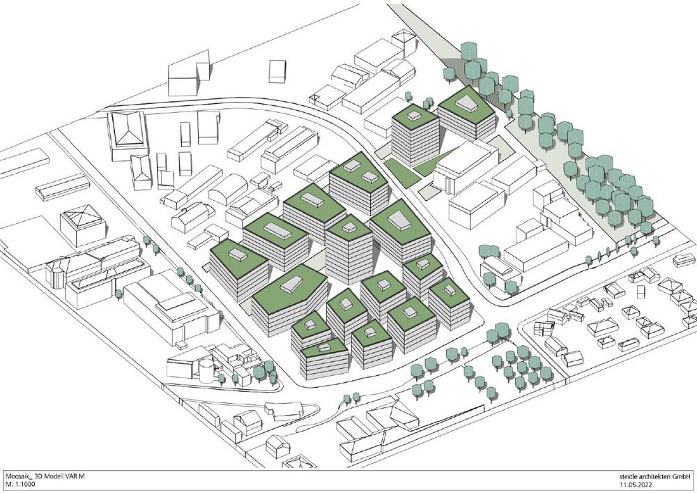 Der Starnberger Stadtrat hat die Vorarbeit der Initiatorengruppe für moosaik – das verbindende Quartier am Donnerstag, den 21. Juli 2022 im Bauausschuss mit einem einstimmigen Votum gewürdigt. Das durch Stadtbaumeister Stephan Weinl vorgestellte städtebauliche Konzept wurde seit der letzten Behandlung im Stadtrat vor rund einem Jahr insbesondere im Bereich Wohnen und Landschaftsplanung vertieft und weiterentwickelt. “Es wurde ein halbes Jahr intensiv am Städtebau gearbeitet und wir haben ein sehr gutes Ergebnis”, erklärt Stephan Weinl. Die Herausforderungen bei der Freiraumplanung sowie hinsichtlich der Verschattungen und emissionsfreier Wohnlagen konnten von den Architekten gelöst werden.