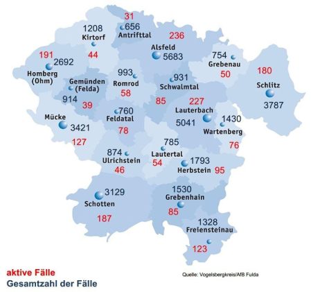 225 neue Corona-Fälle meldet das Gesundheitsamt des Vogelsbergkreises am Freitag. Niemand hat sich bei der Behörde als genesen gemeldet, sodass diese aktuell 2012 aktive Fälle bereut. Laut Robert-Koch-Institut (RKI) liegt die Sieben-Tage-Inzidenz im Vogelsbergkreis bei 1073,9 – hessenweit bei 1018,6. Die Sieben-Tage-Inzidenz der Hospitalisierungen in Hessen weist das RKI mit 7,58 aus. Die Übersicht für […]